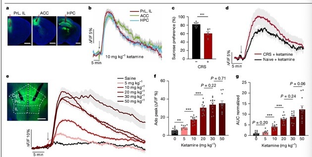 Using genetically encoded fluorescent probe technology, the team achieved real-time observation of adenosine signals in the brains of living animals for the first time. Results showed that both injection of low-dose ketamine and application of electroconvulsive stimulation triggered a rapid, substantial, and sustained increase in adenosine levels in the medial prefrontal cortex—a key brain region for emotion and advanced cognitive functions.