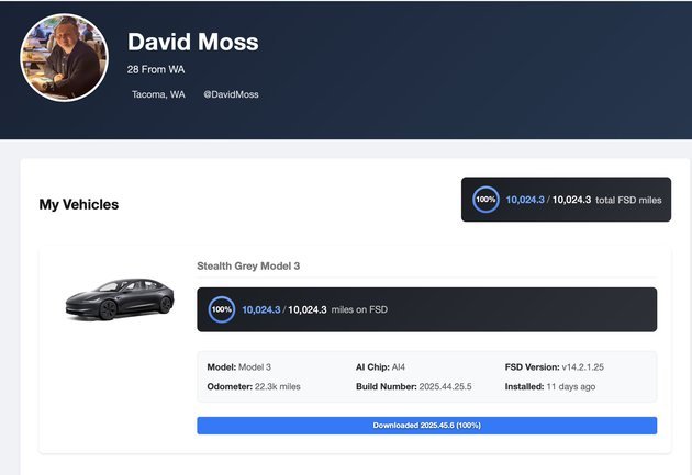 Moss also became the first owner in the world to be certified for driving 10,000 miles continuously using Tesla FSD.