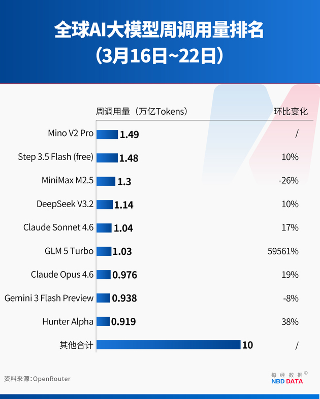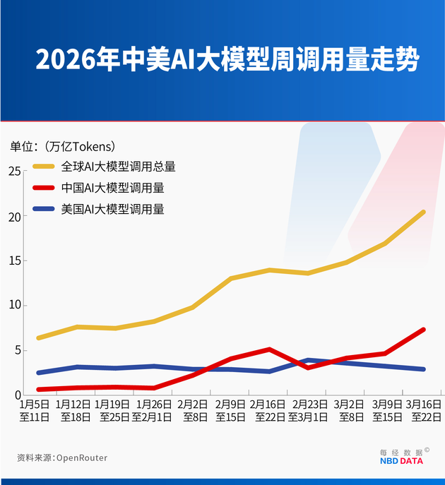 Based on the latest data from OpenRouter, National Business Daily (NBD) noticed that global AI large model usage reached 20.4 trillion tokens in the week of March 16–22, up 20.7% week-over-week.